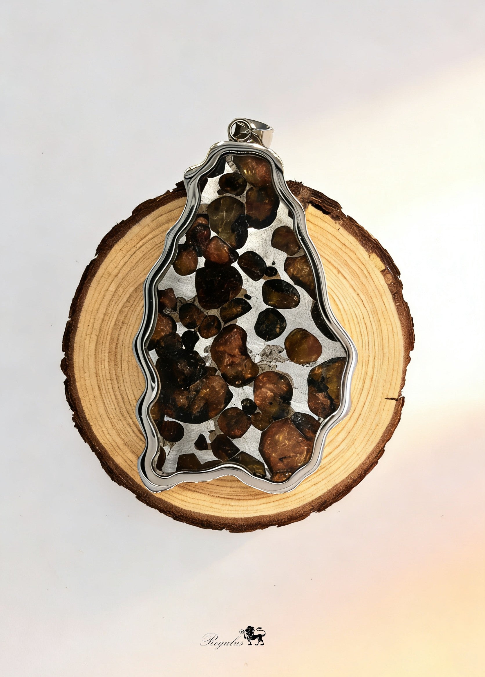 At the heart of this pendant lies a slice of pallasite meteorite from the early solar system.Born at the boundary between a shattered asteroid's core and mantle, forged in interstellar collisions, it journeyed across the vast cosmos to finally reach your palm. Every Widmanstätten pattern—an intricate weave of iron-nickel bands and olivine crystals—is a stellar poem written by time itself.